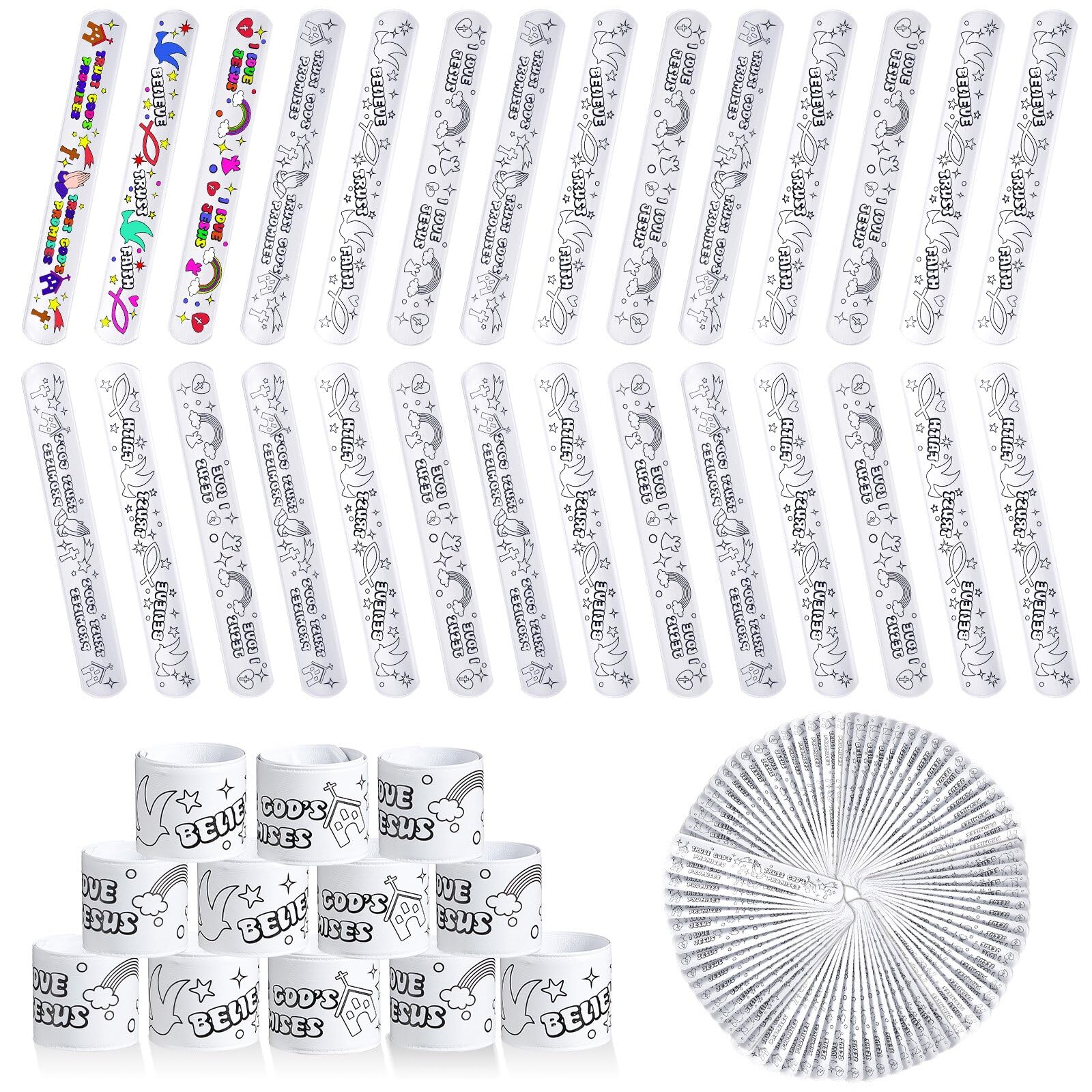 Color Your Own Faith Slap Bracelets Jesus Bracelets for Easter Kids Christian Religious Craft Blank Slap Bands with Religious Sayings for Sunday School Crafts Coloring DIY Gifts 3 Styles(300 Pcs)